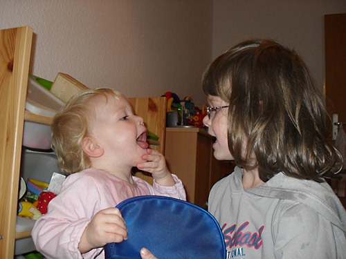 Andererseits gibt es da ja aber auch so Momente, wo sie einfach :herz: sind. Heute z.B. wollte Jana helfen, Lena auszuziehen. Also 2 Kinder auf dem Wickeltisch, Lena dauernd am jammern, Jana würde ihr weh tun (was sie natürlich nicht tat). Und irgendwann gab ich einen Kommentar zum Thema Schwesterngezicke ab, woraufhin Lena nur sagte: “Freunde”. Sie bestand darauf, Jana wäre ihre Freundin und ihre Schwester :herz: .