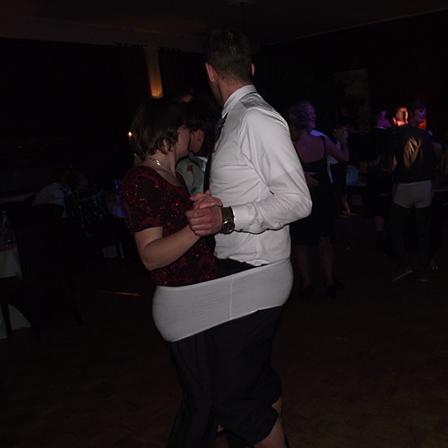 Eigentlich wollten wir uns dann ganz unscheinbar kurz vor 0 Uhr verabschieden, aber Sandra3 bekam das früh genug mit und zog ein Spiel vor, das eigentlich erst nach der Hochzeitstorte vorgesehen war. Hinterher war mir auch klar wieso: sie brauchte noch ein paar Frauen in Hosen. Rache hab ich ihr schon angekündigt *g*. Das Brautpaar sollte jeweils 6 Männer und 6 Frauen holen und verteilen aufeinander. Prompt teilte mir Marc einen langen Mann zu, der mir auch schon den ganzen Abend bekannt vorkam, statt Dirk zu nehmen mit dem Chris ja schon die ganze Zeit unterwegs war. Tanzen zu Disco-Fox war gefragt. Ok, ging ja noch. Nach ein paar Sekunden stoppte Sandra die Musik und forderte die Männer auf, ihre Hosen bis zum Knie hochzukrempeln. Mir schwante schon Übles, aber wir sollten weiter tanzen. Wieder ein paar Sekunden später: es wurden überdimensionale Baumwollhosen an die Männer verteilt, die sie anziehen sollten *g*. Sah doof aus, aber ok Zwinkerndes Smiley . Weitertanzen. Und dann: “Bitte die Frauen mit in die Unterhosen” shock . Wir versuchten uns durchzumogeln mit allen möglichen Tricks (ein Loch für meine Beine, ein Loch für seine *g*) und schlussendlich zog er sogar die “sie ist verheiratet und hat 2 Kinder”-Karte *lach*. Aber keine Chance bei Sandra3. Also mussten wir und prompt wechselte die Musik und wir durften Lambada (oder so ähnlich *fg*)tanzen *örghs* und natürlich auch noch das gaaaaaaaaanze Lied durch. Der arme Kerl tat mir richtig leid Smiley mit geöffnetem Mund .