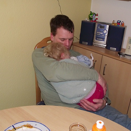 Danach war dann für uns aber wirklich Schluss und wir fuhren nach einer lieben Verabschiedung von allen nach Hause. Dort hüpfte ich nach oben, um Valeska nach unten zu scheuchen zu Chris der im Auto wartete, und fing an die Kinder zu verteilen. Lena von der Couch in ihr Bett und Jana vom Sessel aus in unser Bett. Die hätte ich bei aller Liebe nicht aufs Hochbett hinauf bekommen. Nun klappt es also auch mit dem Babysitter Smiley mit geöffnetem Mund.