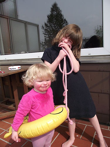 Als ich Mittags wieder kam, hieß es für mich: Haushalt, Meeris ausmisten und Einkaufen. Chris und Peter und später Chris und Schwiepaps machten derweil im Wohnzimmer weiter und die Kinder ließen ihre Fantasie spielen. Aus Lena wurde “Lele”, aus Jana “Jaja”, ich mutierte zum Monsterhai (und hab Jana und Lena im Gästeklo mal so richtig erschreckt *fg*) und Roddy und ein Hüpfball wurden zu Pferden, die aus dem Wasser gerettet werden mussten. Zwischenzeitlich mussten sie dann leider doch sterben und Lena musste gerettet werden (mit ihrem Schwimmring um).