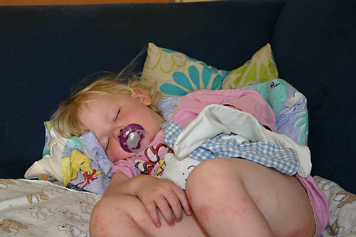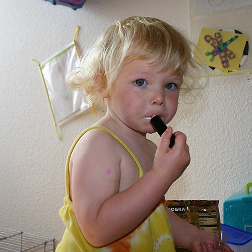 Aber natürlich gab es heute noch viel mehr. Heute morgen (mal wieder arg früh, Chris durfte noch eine Stunde schlafen), jaulte Lena. Ich Babyphone aus, Kind rüber geholt und während sie sich häuslich einrichtete in unserem Bett, bemerkte sie das ausgeschaltete Babyphone und beschwerte sich beleidigt lautstark: “Du hast mich ausgeschaltet!”. Geruhsam starteten wir in den Morgen, mein Einkauf dauerte ein wenig länger weil wir wegen vergessenem Geld noch mal zurück nach Hause mussten und kaum wieder hier wurde "die Party” vorbereitet. Halb 12 klingelte es auch schon an der Tür und Marie und Anne kamen hoch. Marietypisch direkt nach dem Reinkommen die Frage: “Gibt es Bologneseauflauf heute?”. Gab es. Aber erst rannten die Kinder hier rum, während ich auf dem Balkon saß und als ich gegen 13 Uhr dann doch mal den Ofen anschmiss für eine erste Mahlzeit in Pizzaform und in den Flur kam, fühlte ich mich arg an Dr. Kawashima erinnert. 3 Kinder aus Janas Zimmer raus, 1 ins Wohnzimmer, 2 in Richtung Toiletten. 1 Kind aus Janas Zimmer ins Wohnzimmer. 1 Kind vom Bad ins Wohnzimmer, 3 wieder raus in die Küche, 1 Kind vom Bad in Janas Zimmer. Und so weiter und so fort. Hätte nur noch die Abfrage von Dr. Kawashima gefehlt, wie viele sich denn im Wohnzimmer befinden *g*.