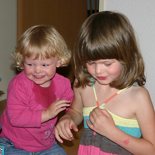 Heute morgen waren Lena und ich beim Neurologen und ausgerechnet auf dem Parkplatz von Netto ging danach hinten im Auto ein “Sanne”-Gejaul  los. Jupp, Sannes Auto stand da, aber nur “Oma” konnte begeistert begrüßt werden. Mein Kind hat Sanne-Entzug shock , weshalb sie morgen früh 2 Stunden hin darf, während ich zur Krankengymnastik gehe. Morgen Nachmittag dann Schnuppergarten, das nenn ich Erholung für mich Smiley mit geöffnetem Mund . Zumal ich heute schon haushaltstechnisch alles in Ruhe gemacht hab, während hier die Horden durchrasten. Ursprünglich hatte Jana gefragt, ob Madina kommen könnte. Madina kam und brachte Martha mit (ihre kleine Schwester). Diese Kinder sind unglaublich, die räumen auf. FREIWILLIG! Ich musste höchstens mal drauf aufmerksam machen, das sie irgendwas auch wieder wegräumen könnten und schon war es wieder weg. Und weil es gerad so friedlich für mich war, kam Melanie mit Ebba, während Jack beim Sport war und wir konnten schön quatschen, während die großen Mädels mit den Kleinen spielten. Um 17 Uhr noch Jack dazu und um 17.45 Uhr war der Besuch weg. Aufzuräumen blieben mir nur Kleinigkeiten, ansonsten hatten die Mädels alles wieder weg gepackt. Unglaublich!
