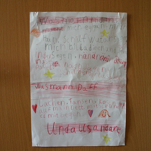 Was man darf: Lachen, Tanzen, Kuscheln, auf mein Bett, mit Schuhen rein. CD mitbringen.