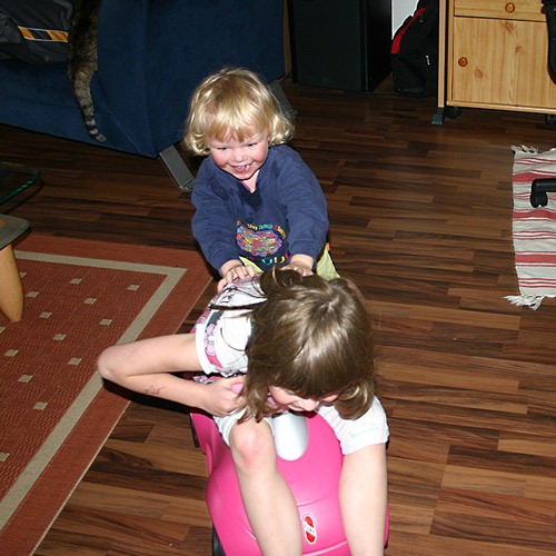 – Heute Nachmittag hab ich Lena gefragt, ob sie eben mit runter zur Waschküche kommt, die Wäsche hochholen. Eigentlich eine rhetorische Frage. Lena war anderer Meinung: “Mama, ich bin doch schon groß, ich kann hier bleiben.” Okaaaaaay. Die Wohnungstür hab ich dann vorsichtshalber zugeschlossen, aber 3 Min. später als ich wieder da war, saß sie immer noch friedlich spielend im Spielzimmer.