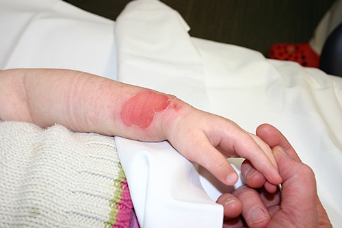 Lena ertrug wieder mehr als tapfer den Verbandwechsel und die Reinigung und versuchte ganz doll nicht zu weinen. Das, was da jetzt drauf liegt (schaut ein wenig wie Gips aus und wird auch so hart) wird von alleine abfallen, wenn sich darunter Haut bildet. Wir sollen Ende der Woche zum Kinderarzt, damit der noch mal schaut und wenn nötig wechselt. Kiga ist erlaubt, Sandkiste nicht und: es waren doch Verbrühungen 1. Grades UND 2. Grades.