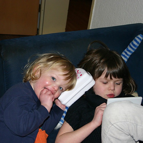 Meine Laune wurde auf dem Flohmarkt (bei der Saukälte) dank nörgeliger Lena auch nicht wirklich besser, aber immerhin fand ich mein langgesuchtes Spiel für die SNES (Young Merlin), Jana fand ein 4D-Modell eines Frosches zum Selberbauen und Lena fand einen aufziehbaren Plüschhamster. Und dann hatte ich noch das Glück, Janas Lieblingshose zu ergattern. Sie hat eine Hose (im Forum vor einiger Zeit gekauft), die sie total liebt und die sie mir bis jetzt jedes Mal wieder von der Wäscheleine geklaut hat, obwohl ich die schon lange im Keller versenken will weil sie viel zu kurz geworden ist. Und genau DIE Hose lag nun dort, allerdings ohne Größenschild. Für 2 Euro nahm ich die einfach mal mit, hielt sie an die alte Hose und: sie ist knapp 5 cm länger und passt damit *freu*. Nur Chris verließ den Flohmarkt mal wieder ohne etwas gefunden zu haben.