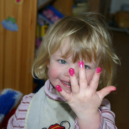 Memo an mich: in Zukunft nicht nur Lenas Nagellackfläschchen auf dem Kleiderschrank unterbringen. Sämtlichen Nagellack für sie unerreichbar unterbringen!!! Den Nagellack heute hatte sie heimlich still und leise bei Jana im Zimmer gefunden. Aber: sie war zwar großzügig an ihren Fingern, aber Fußboden, Kleidung und co. sind sauber geblieben.