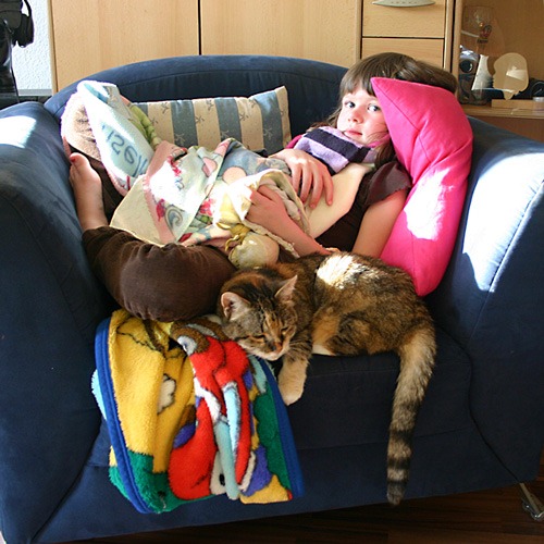Mein Physio ist ein Sadist, ich schwör’s *jammer*. Hat der heute an mir rumgedrückt *motz*. Wobei Lena ihn fast noch übertraf. Am Ende jeder Massage gibt es ja irgendein Zeug (wie auch immer das heißt) auf den Rücken und er klopft noch mal den Rücken ab. Lena klopfte heute mit *autsch*. Jana durfte derweil mit ihrer Physiotherapeutin Übungen machen und klagte über Streit in der Schule und ein wenig Halsschmerzen. Danach ging es noch zum Tanzen und eigentlich wollte um 16 Uhr noch A. kommen, schaffte es aber nicht. Also haben wir noch gespielt, Jana hat auf der Couch gelitten und schon war es fast Feierabend. Im Kindergarten wurden heute Fotos gemacht und eigentlich war ich ein wenig traurig, keine Geschwisterbilder zu bekommen, weil Jana bis 12.45 Uhr Unterricht hatte. Als ich im Kiga ankam, waren die Fotografinnen aber immer noch dabei und es wird nicht nur Geschwisterfotos geben, Jana wurde auch noch mal (genau wie Lena vorher) alleine fotografiert. Haben muss