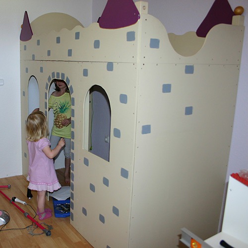 Und mein furchtloses Kind, das auf Janas viel höherem Bett rumturnt ohne Ende, bekam vorhin Panik vor ihrer eigenen Courage und schläft jetzt unten im Haus Smiley . Mit Lichterkette. Und vielen, vielen Kuscheltieren. Gibt es halt erst später den von ihr gewünschten Tisch mit Stühlen im Haus.