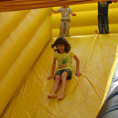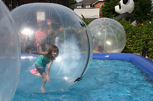 Genau so wie die Kugeln, die Kletterwand (links) und die kleinen Spielstände auf dem Weg. Dosenwerfen, Klettbällepunktewerfen und “Kuh” melken standen dort auf dem Plan. Und natürlich: Hüpfburg Nr. 2 (die rote Scheune im Hintergrund).