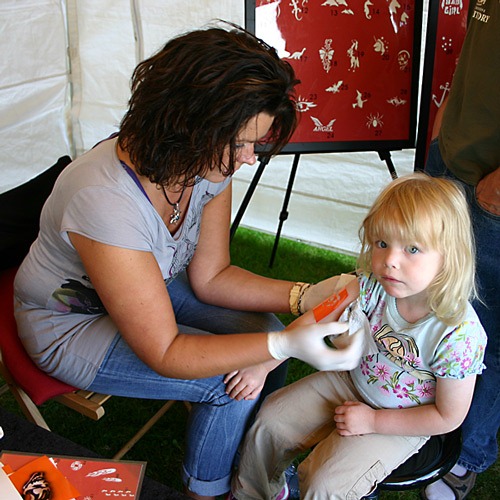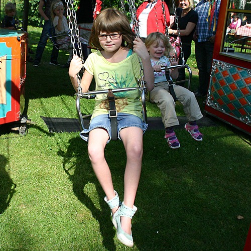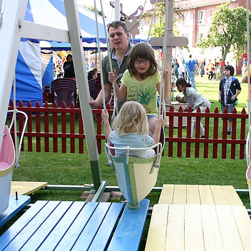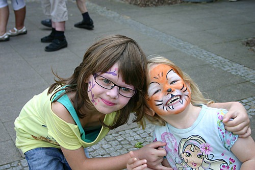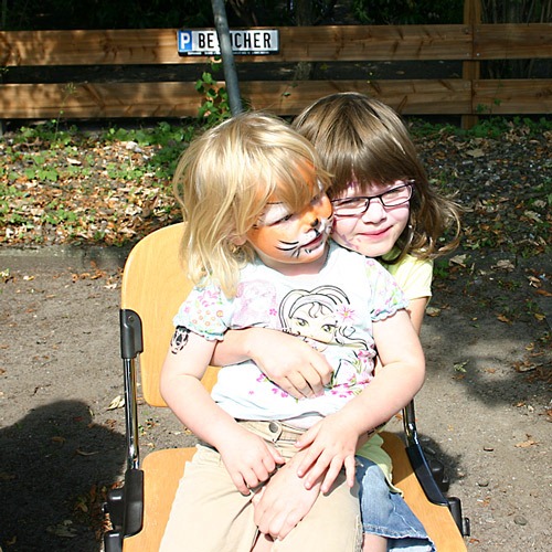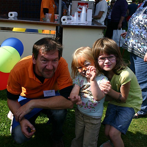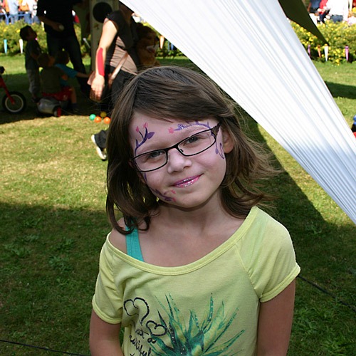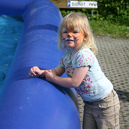 Die Kinder wollten natürlich alles abklappern und so fingen wir bei der ersten Hüpfburg an, gingen übers Kettenkarussell zu den Schiffsschaukeln und Lena durfte eine Runde auf einem Pferd drehen. Lose mussten auch geholt werden (inzwischen war schon richtig Betrieb) und weiter ging es mit Airbrush Tattoo und Schminke. Die Kinder haben geduldig gewartet, die Erwachsenen waren zum Teil weniger geduldig. Als wir das erfolgreich hinter uns gebracht hatten, ging es für eine zweite Runde Würstchen zu Brüderchen.
