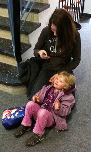 Heute morgen nahm ich Jana mit zur Arbeit. Die Frühstückspause verbrachte sie großteils bei R., aber dann kam sie mit mir zum Glattmachen. Danach hatten wir immer noch knapp 20 Minuten bis zur Tanztheaterwerkstatt, also kam sie erst noch mit ins Büro und half mir da ein wenig. Sie druckte die Signaturen für die CDs aus, während ich die beschriftete und beklebte und kommentierte hinterher: “Das macht Spaß. Wir tauschen, ich geh hier arbeiten und du gehst für mich zur Schule.”. Jaja Kind, später Zwinkerndes Smiley .