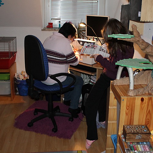 Dauerte auch gar nicht lange, dann kamen nacheinander Chris und Schwies und wir konnten Kaffee trinken, die PS3 (die Männer) und die Nähmaschine (Jana + Oma) anschmeißen. Und schon ist Feierabend und Chris spielt hinter mir GTA V, das er heute bekommen hat