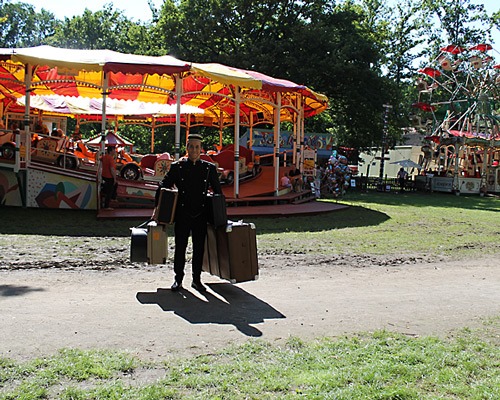 Von heute bis Sonntag gibt es eine alte Dorfkirmes. Inkl. “Hau dem Lukas”, “Raupe”, “Riesenrad” und – wie man sieht – einem Clown/Entertainer (ich war mir da nicht ganz sicher). Der Gute war auf der Suche nach dem Bahnhof und zog ein riesengroßes Baguettestangen-Telefon aus der Tasche