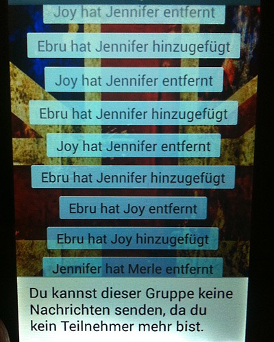 Und dann ist da noch die What’s-App-Gruppe von Janas Freundinnen. Jana wurde aus Versehen raus gekickt, der Rest war so beabsichtigt *lach*. “Du bist nicht mehr meine Freundin” im modernen Zeitalter