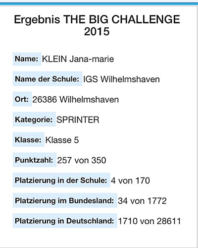 . Vor ein paar Wochen gab es einen Multiple-Choice-Englisch-Test. Bundesweit, “The Big Challenge”. Die Fragen komplett auf Englisch gestellt mit zum Teil unmöglichen Fragen für Kinder, die gerade mal ein 3/4tel Jahr Englisch haben. Das “to place a order” im Restaurant benutzt wird, wie die Londoner U-Bahn heißt und das Harry und William Brüder sind, müssen Fünftklässler doch eigentlich nicht unbedingt wissen können, oder? Vor ein paar Tagen konnte man sich erst die Lösungen ansehen im Internet, mittlerweile gibt es die Ergebnisse anzuschauen für die Kinder: