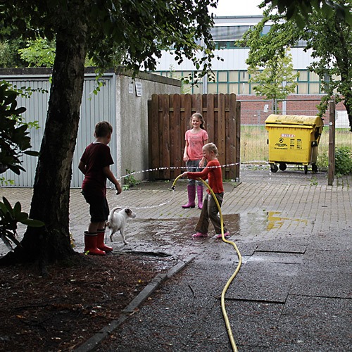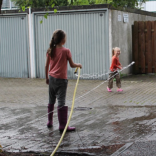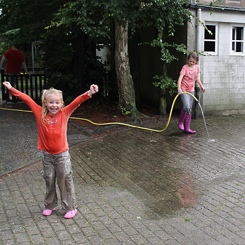 Ein Heidenspaß für die Kinder: rum sauen mit dem Wasser, das die Pumpe aus dem Keller holte