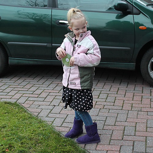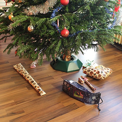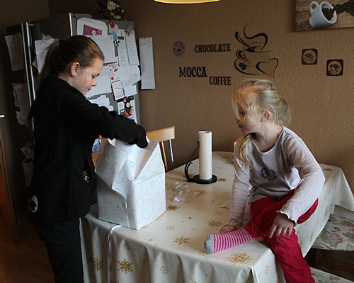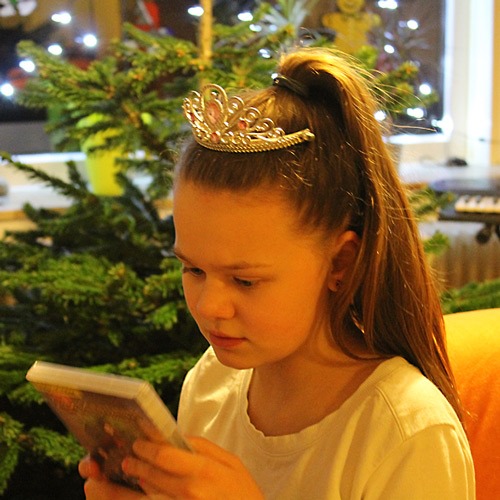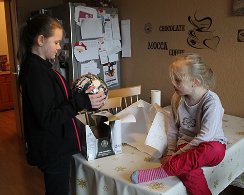 Jana bestand darauf, ihre Geschenke unter dem Tannenbaum abzulegen. Lenas Geschenk wurde zur Rute erklärt (in Wirklichkeit ein Eisköniginnen-Regenschirm) Smiley mit geöffnetem Mund.