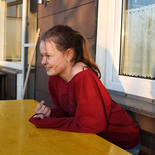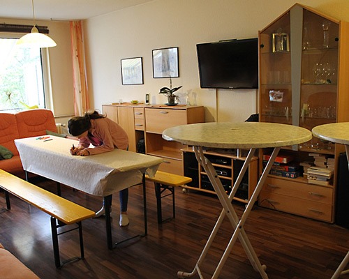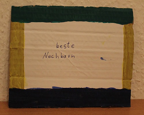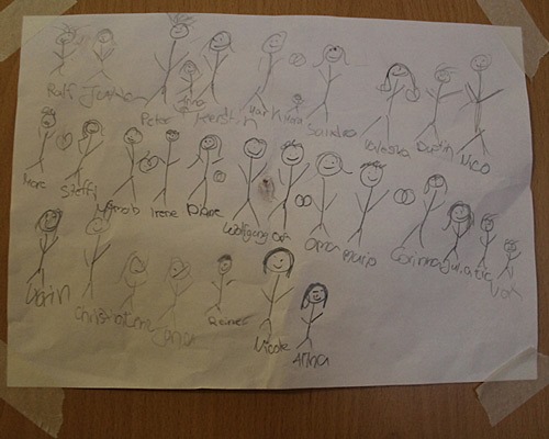 Die voll beschriebene Tischdecke hat Jana heute eingesackt, als Erinnerung. Man sollte es nicht glauben, aber auch Erwachsene scheinen einer weißen Papiertischdecke und Stiften nicht wiederstehen zu können *g*.