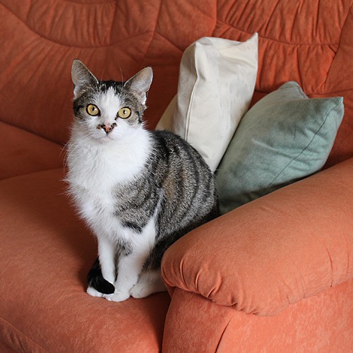 Liebt unsere Betten (ganz besonders Lenas) und unsere Küchenstühle. Schafft es nicht, auf unsere Küchenzeile zu springen (yeah!), hat die anderen Tiere noch nicht entdeckt (oder ignoriert sie) und statt zu fauchen, miaut sie leise jaulend wenn ihr was nicht passt. Ach ja, und sie heißt Lucky Smiley.