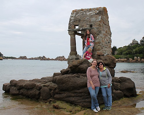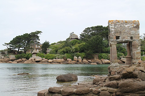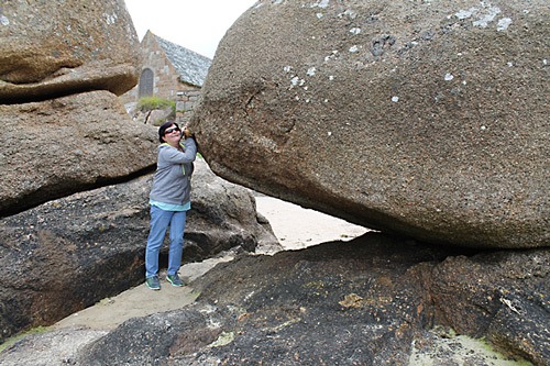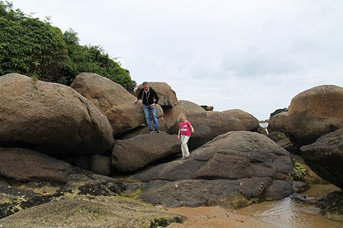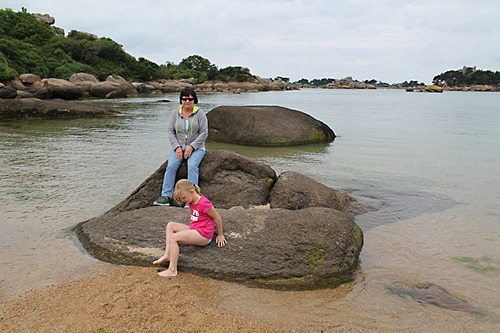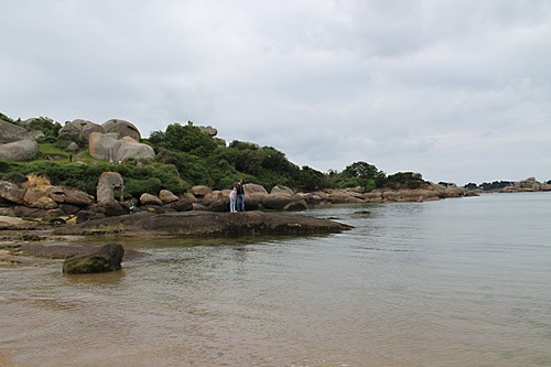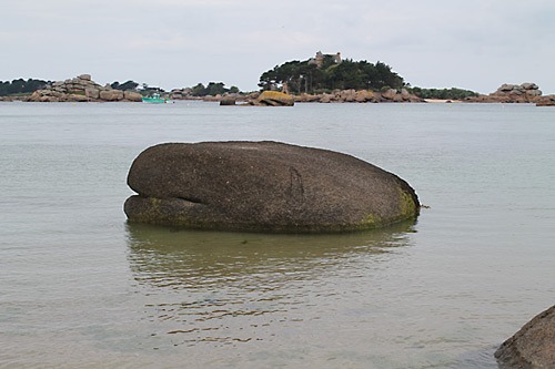 Am Strand von Saint-Guirec. Traumhafte Steingebilde, das Oratorium (bei dem die Frauen früher “orakeln” konnten, ob ihr Liebster der richtige ist) und rechts hinten im Bild die Insel mit dem Castel, das Dieter Hallervorden gehört.