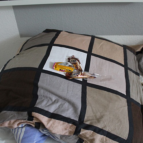 Bin ich nicht eine nette Mutter? Da sammel ich ihr doch glatt den Müll zusammen, den sie neben das Bett auf den Boden geworfen hat. Jetzt dürfte es ihr leichter fallen, den in den Mülleimer zu befördern. Jedenfalls, wenn sie auf ihrem Kopfkissen schlafen möchte *grummelmotzschimpf*.