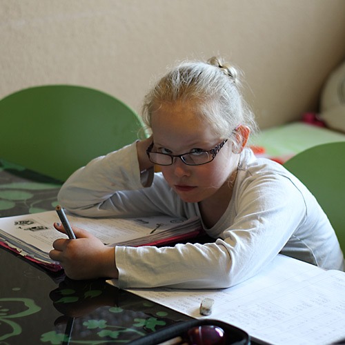 Man sieht ihr förmlich die Begeisterung an, gelle? 4 Seiten Mathematik haben die Kinder die Woche aufbekommen. Und nur ein Bruchteil ist auf dem Arbeitsblatt zu lösen. Lena hat 1,5 Blätter fertig (Ballettprobe rief) und schon 3 Seiten im Matheheft voll. Wann wir nebenbei auch noch fürs Diktat üben sollen, ist mir ein Rätsel.