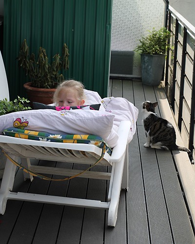 Eigentlich wollte Jana mir nur zeigen, wo Lucky immer liegt. Und fand den Platz dann überaus bequem.