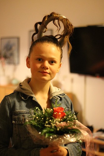 Jana gestern Abend nach ihrem Auftritt bei der Eröffnung der Schlosskonzerte. Um 23 Uhr lagen wir endlich alle im Bett nachdem wir die ganze Dose Haarlack aus dem Haar gewaschen hatten *g*.