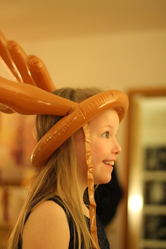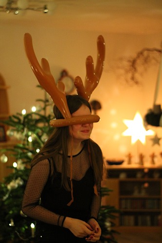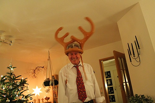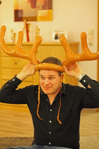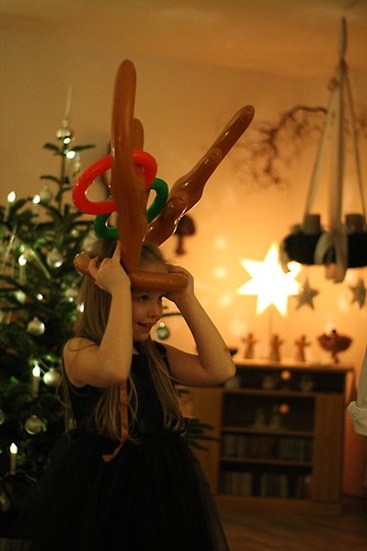 Dieses Jahr: Ringe aufs Elchgeweih werfen. Wer trifft, darf ein Paket nehmen und wem das Geschenk im Paket gehört, ist der nächste “Elch”.