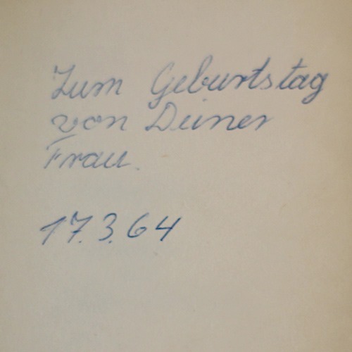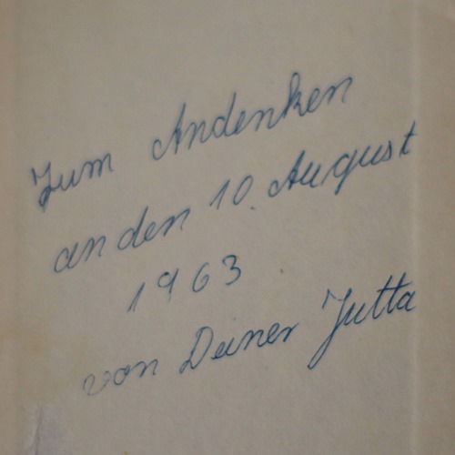 Beim Brüderchen abgegriffen: zwei alte Büchlein mit Widmung und den alten Wilhelm-Busch-Sammelband. Diese Widmung hat meine Mama kurz nach ihrem Kennenlernen geschrieben. Ich meine sogar, anlässlich ihrer  – sehr schnellen – Verlobung.