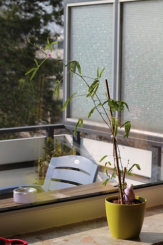 Ich brauche einen neuen, größeren Stab. Meine Mimose wächst und blüht wie verrückt. Hübsche rosa Blüten sind das.