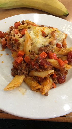 10-15 Nudeln begraben unter Unmenge von Hackfleisch und Karotten. Mit so ziemlich null Gewürzen. Eindeutig eher Low Carb, als Low Fat. Aber Essbar *g*.