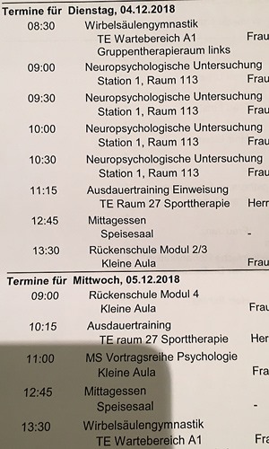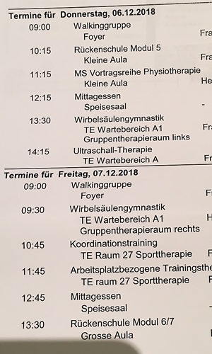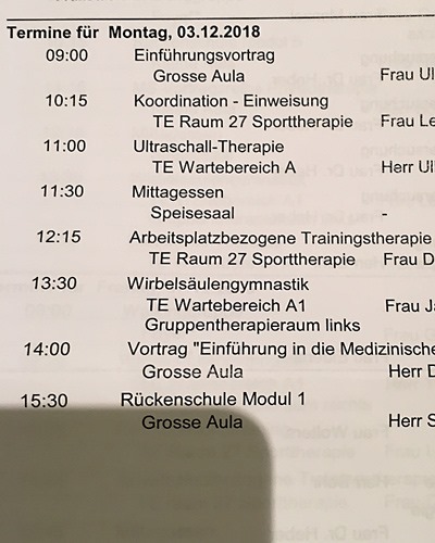 Koordination war Gleichgewichtstraining, Arbeitsplatzbezogene Trainingstherapie war Gerätetraining, die Wirbelsäulengymnastik ganz nett und die Rückenschule der 3. Vortrag heute (da konnte ich schon nicht mehr sitzen).