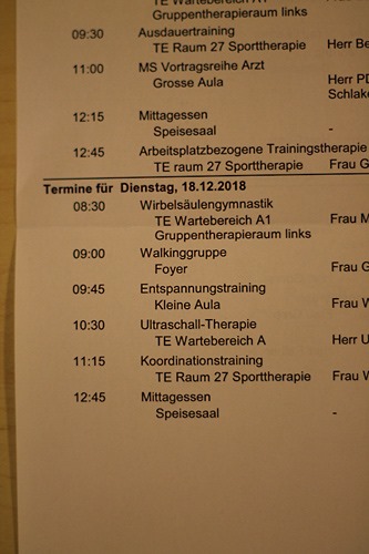 Nach 20 Minuten Wirbelsäulengymnastik bei einer anstrengenden Trainerin darf ich innerhalb von knappen 10 Minuten mich wieder anziehen, nach oben hetzen, Puls messen und los walken. Nach dem walken nochmal ganze 10 Minuten Zeit, um mich umzuziehen und zur Entspannungsgruppe zu hetzen. Wenn es an dem Tag auch noch regnet wird es lustig. Aber he, dafür hab ich dann um 11.40 Uhr alles für den Tag erledigt. Außer dem Mittagessen, das eine Stunde später angesetzt ist … Ich würde mal sagen, das ich um 11.50 Uhr essen gehe mit M. und dann nach Hause fahre *g*.