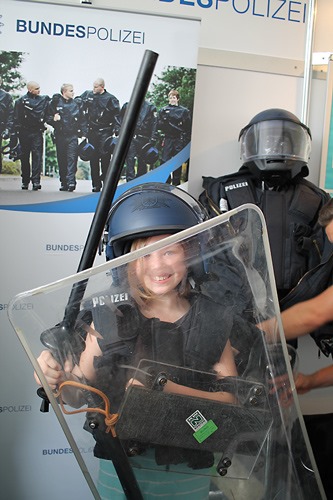 Heute morgen wollte Jana nicht mehr mit und Chris ging mit Lena und mir alleine. Pastor W., der Chris und mich getauft hat, haben wir schon mal darauf vorbereitet das er uns in 8 Jahren trauen darf. Gummitwist probierte Chris, mit “Noah” ließen Lena und Chris sich fotografieren. Wir plauderten mit einer Polizistin aus Braunschweig, mit einem Polizisten aus Hannover, mit einem Polizisten aus Oldenburg, mit Freiwilligen vom ASB (Letzter-Wünsche-Wagen) und mit so, so vielen mehr. Den Trachtenumzug wollten wir uns nicht anschauen, so blieb uns der Regen erspart.