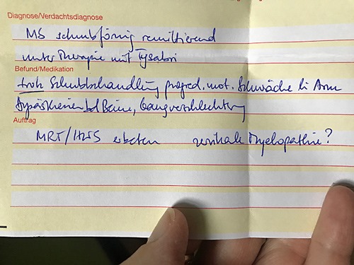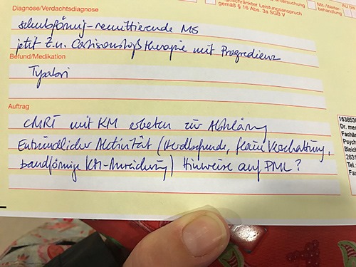 Fazit des Tages: anscheinend keine PML, kein Kontrastmittel aufnehmender Herd. Was nach 5 Gramm Cortison aber eh ungewöhnlich wäre. Also Letzteres. Allerdings “etwas”, was genau wird man im nächsten MRT sehen (ob abflauender Herd oder sonstiges). Falls die nächsten Tage Verschlechterung: ab ins Krankenhaus für erneutes MRT (um zu sehen, ob das etwas sich verändert hat) und Plasmapherese. Ansonsten: abwarten, Tee trinken und MRT Termin HWS machen, weil natürlich auch da der Herd sitzen könnte. Oder – was nicht auszuschließen ist – mal nicht die MS, sondern vielleicht die Wirbelsäule selber das Problem sein könnte.