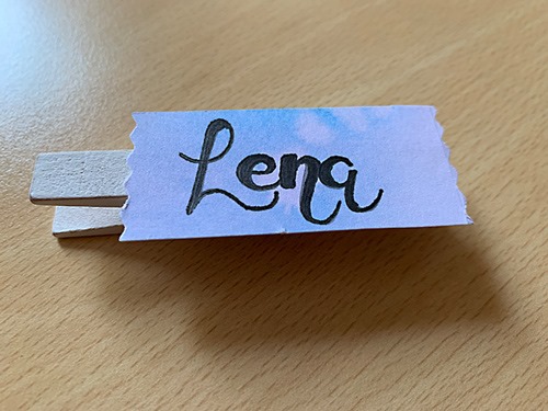 Lenas Namensschild für unsere Julius-Club-Veranstaltung heute. Thema: Handlettering. Viel gemacht hat sie dann aber nicht, weil sie sich mit einem Mädchen verquatscht hat die uns hinterher sogar noch ein langes Stück begleitet hat. Nummern wurden ausgetauscht *g*.