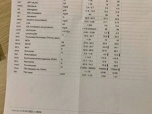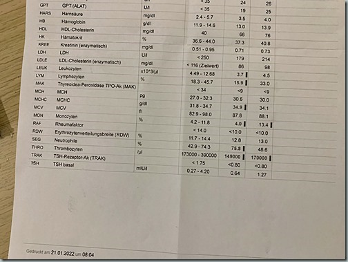 … werde ich Montag telefonieren müssen. Heute habe ich meine Blutergebnisse hin gefaxt und eigentlich sollte Frau Doktor zurückrufen, aber irgendwie muss ich untergegangen sein. Meine Lymphozyten sind steil nach unten gefallen. Unter 500 müsste ich mit der Gürtelrose-Prophylaxe anfangen und bei mir waren die Lymphozyten Mittwoch bei 582. Aber mal abwarten, was Frau Doktor dann sagt. Eigentlich sollten die Werte erst in 2 Wochen so aussehen.