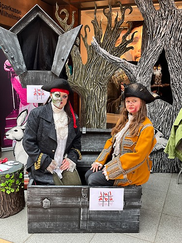 … durfte sich heute verkleidet und geschminkt durch die Nordseepassage bewegen (Junge Landesbühne, 25-Jahr-Feier-Nordseepassage und Piraten-City). Um mir das anzuschauen, habe ich heute extra eine Pause eingelegt und bin schnell von der Arbeit rüber gelaufen. Und weil das Wetter heute Abend wieder schön und trocken war, konnten Chris und ich gerade auch noch eben an den Bontekai und rüber zum Südstrand.