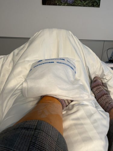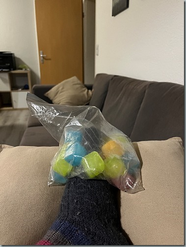 … konnte auf meine Frage wegen der Schiene nur entgegnen: “Das müssen Sie Ihren Operateur fragen”. Hab ich also getan. 3 Monate Tag und Nacht diese merkwürdige Schiene, deren Klettbänder jetzt schon nicht besonders gut halten. Na denn. Fäden ziehen am 9.12., Röntgen und Vollbelastung erst am 13.1.. Vorher war kein Termin frei. Ich frag mich echt, wie sie mich heute dazwischen gequetscht haben so kurzfristig.