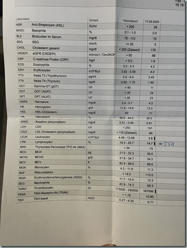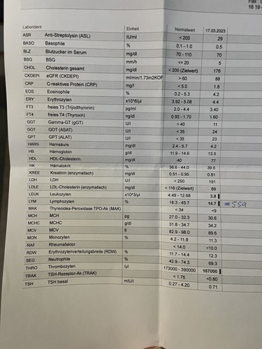 559 Lymphozyten (ich rechne immer für meine Neurologin um *g*). Letztes Jahr hatte ich Anfang März schon 757, aber im Mai dann wieder 665. Aber alles über 500 schaut schon mal gut aus Smiley mit geöffnetem Mund.
