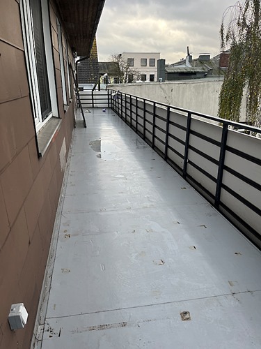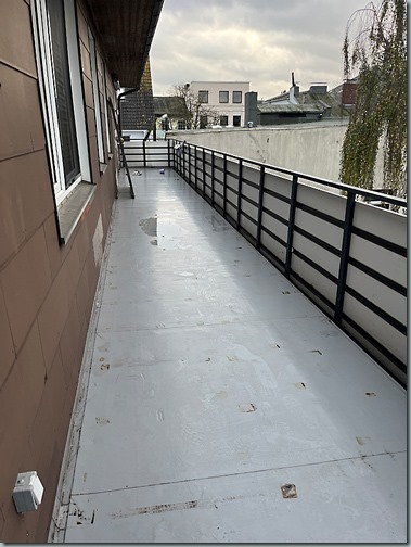 Mal die ganze Länge des Balkons inkl. dem der Nachbarin. Die Tage kommt ein neuer Belag, weil der alte Belag kaputt ging.