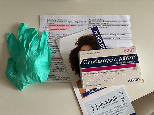 … war heute beim Kieferchirurgen das Gebilde in meiner Lippe. Weshalb der Schnitt auch deutlich größer als gedacht ausgefallen ist und ich mit Antibiotika gehen durfte und das Ding in die Pathologie muss. Zuhause gab es dann von jetzt auf gleich eine ziemlich starke Blutung, also noch mal zurück in die Praxis und später mit Tupfern für den Fall der Fälle nach Hause. In 10 Tagen werden die Fäden gezogen, ich sehe mal wieder aus, als ob mich jemand verprügelt hätte.