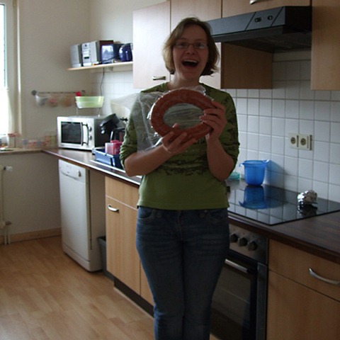 Besagter Hermes-Bote brachte ein Paket für Jana, bzw. mit Kleidung für Jana die ich im Forum gekauft habe. Jana durfte sich auch gleich darauf stürzen und während sie fröhlich ein Teil nach dem anderen auspackte, fischte sie auch eine Tüte aus dem Karton und wunderte sich lautstark, wieso die so schwer und was das denn wäre. In der Tüte war dann tatsächlich: meine Wurst *freuhüpf* Meine heißgeliebte Mettwurst, die beim Schlachter so ein Heidengeld kostet, weshalb ich letztens im Forum einen Thread aufgemacht und gefragt habe, ob jemand in der Nähe des Fabrikverkaufes wohnen würde. Und das liebe Kieselchen hat die einfach mal besorgt und mitgeschickt :herz: