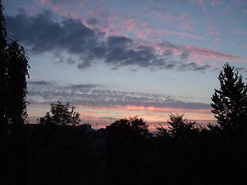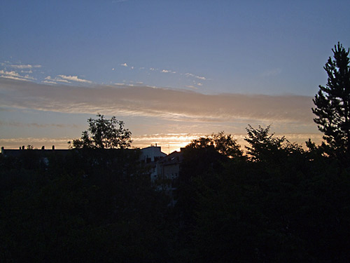 Als wir dann nach Hause kamen, fanden wir mal wieder einen Vogel vor. Diesmal allerdings nicht auf unserem Balkon, sondern unten im Hof. Aus dem Nest gefallen und ängstlich nach seiner Mama rufend 🙁 . Den schönen Sonnenuntergang gibt es gerade umsonst zu dem schönen Tag dazu. In einer Stunde ist dann das Feuerwerk und danach schauen wir uns das jedes Jahr wiederkehrende Verkehrschaos an 🙂 .