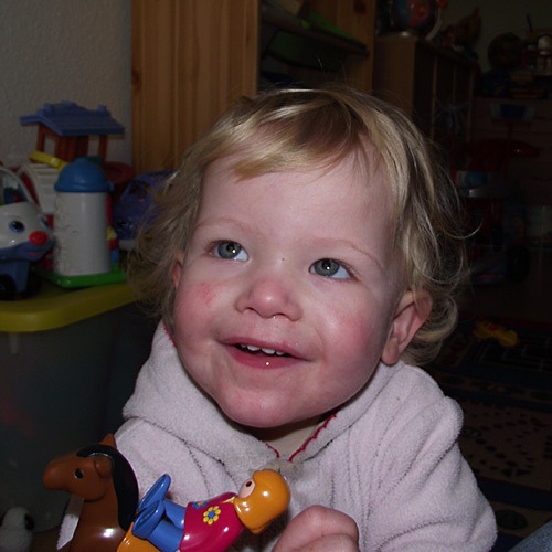 Jana wollte heute bei Anne bleiben, also durfte ich den Nachmittag nur mit Lena verbringen. Und die ist momentan ein wenig merkwürdig drauf. Alle paar Minuten klammerte sie sich an mich “Arm? Arm? Da ist ein/kommt ein Nilpferd Angst!”. Nur variiert von dem selben Spruch nur mit “ein Deo” *lach*. Ich hab ihr dann ein Deo gezeigt *fg*. Andererseits suchte sie zeitweise ihre Höhle *kopfkratz* und wollte, das ich die suche. Und als ich ihr sagte, das sie keine Höhle hätte, aber ja gerne suchen könne, rannte sie “Höhle?” rufend durch die Wohnung *piepvogelzeig*. In ihr Bett wollte sie auch nicht (“Angst!”), dafür schon um 16 Uhr in mein Bett. Alles merkwürdig. Ich vermute gaaaaaaaaanz stark, das mir eine Murmeltier-Nacht bevor steht.