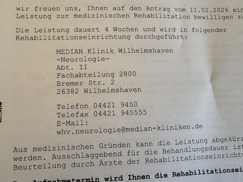 Wenn ich dann nicht schon in die Rehaklinik einziehe, meine Rehagenehmigung für 4 Wochen kam heute auch mit der Post an. Ums Eck, damit ich zu den Elterngesprächen für Lena kann, aber stationär, damit ich auch mal einen Arzt sehe und nicht nur am ersten und am letzten Tag (und vor allem hatten die stationären Patienten auch mal was zur Entspannung und nicht nur Sport + Vorträge).