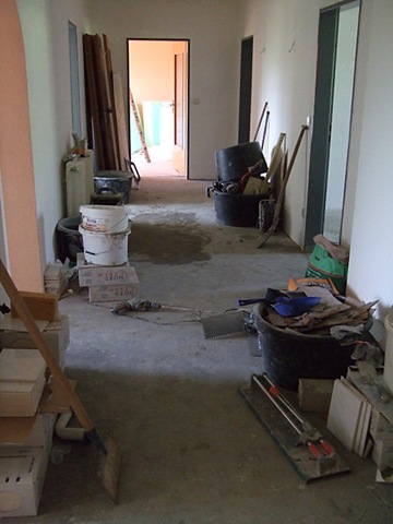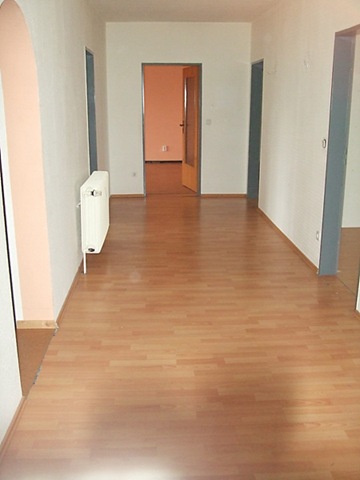 Der Flur, bevor es los ging. Links geht es direkt in Lenas Zimmer (nicht auf dem Foto zu sehen), vor dem Heizkörper geht es zu dem Miniflur mit Gästetoilette und Badezimmer, danach zur Küche. Geradeaus ist das Wohnzimmer, rechts vor dem Wohnzimmer geht ein Miniflur mit Abstellkammer ab zu Janas Zimmer und dem Spielzimmer. Vorne rechts wird schließlich das Schlafzimmer hinkommen.