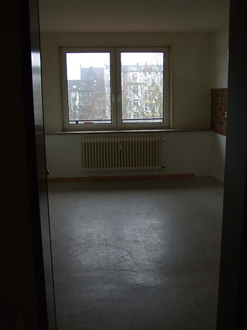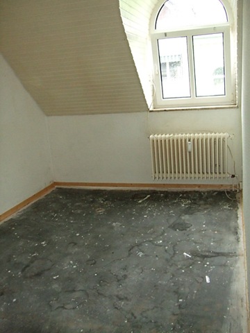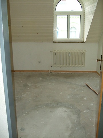 Der Blick in Lenas Zimmer. Hier müssen die Handwerker gar nichts machen, außer das Loch im Fensterrahmen mit Silikon zu verschließen (unser Vormieter musste aus irgendwelchen Gründen Kabel da durch legen).